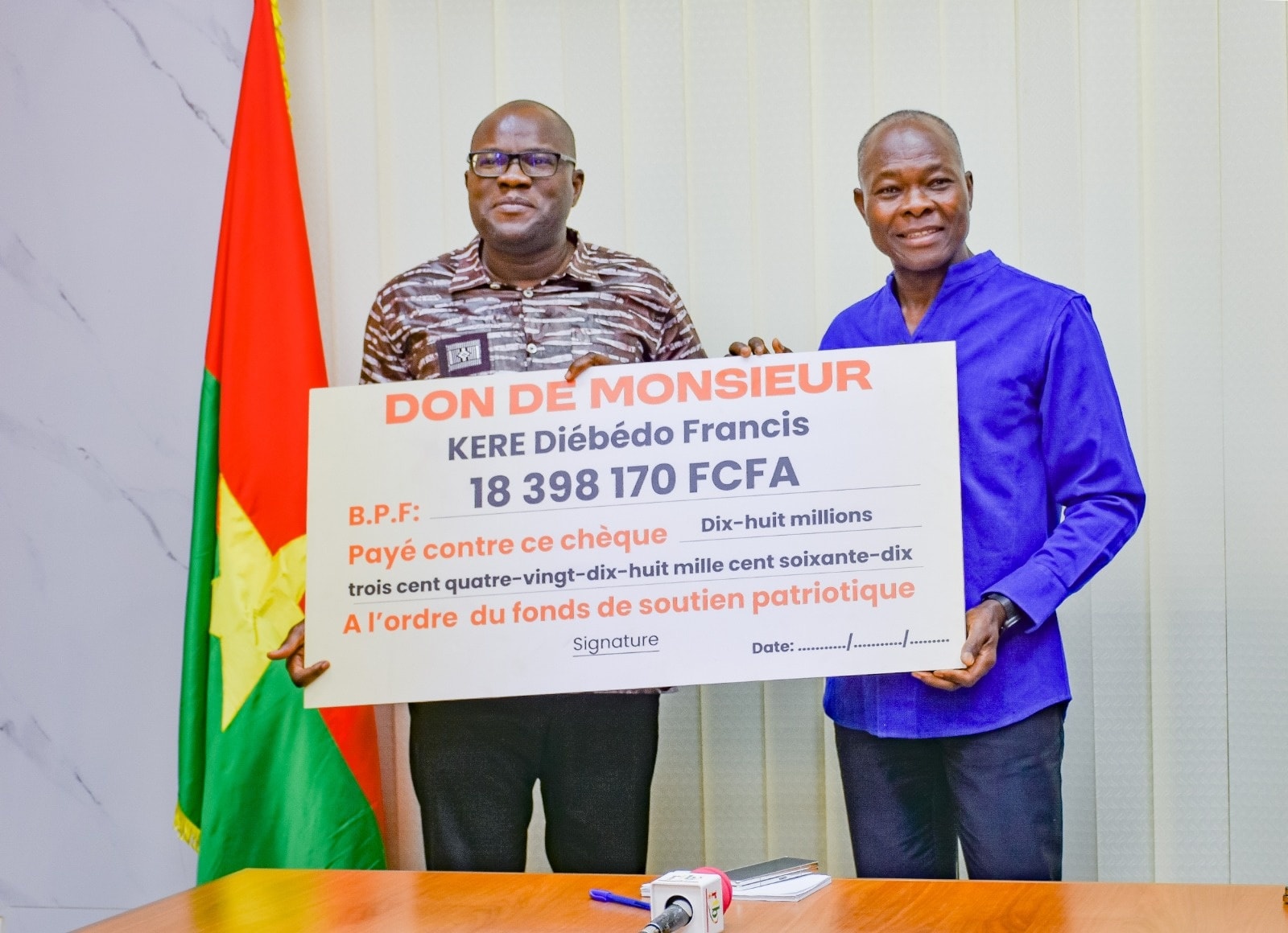 L’architecte burkinabè de renommée internationale, Diébédo Francis KERE, lauréat du prestigieux prix Pritzker, offre la somme de 18 398 170 F CFA au Fonds de soutien patriotique (FSP). Le chèque symbolique a été remis ce mercredi 14 janvier 2026 à Ouagadougou, au ministre chargé de l’Économie Aboubakar NACANABO.